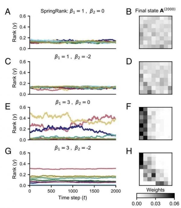 图4中左侧(子图A、C、E、G)表示在不同β1和β2下等级向量的变化情况,不同的颜色跟踪不同节点的等级。右侧(子图B、D、F、H)表示在t=2000时的邻接矩阵。对比子图C和G,子图G中的等级分化更加明显。β1较小时“胜利者效应”较弱,整体近似平均主义。对于更大的β1,会有更明显的赢家效应。