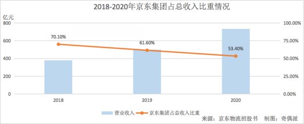 2018-2020年京东集团占总收入比重情况 (制图:奇偶派)