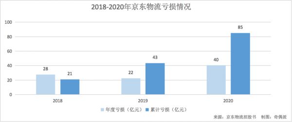 2018-2020年,京东物流的年度亏损分别为28亿元、22亿元、40亿元,同期,累计亏损分别为21亿元、43亿元、85亿元。