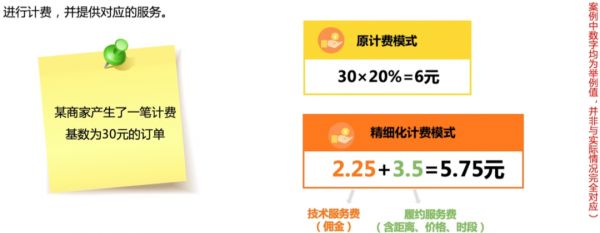 一份计费基数为30元的订单,按照原计费模式,需要向平台支付6元,而如今,精细化计费模式下,需要支付5.75元,节省了0.15元。