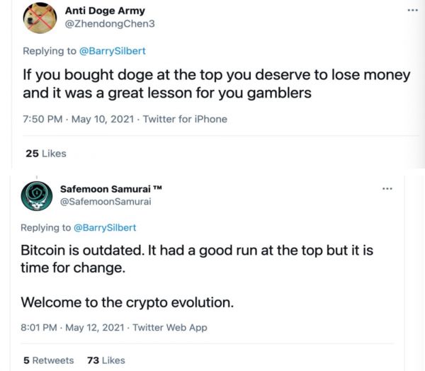 5月8日,灰度也高调进入战场,巴里·西尔伯特连续发了几条推特表示将开始大幅做空狗狗币,并表示会将赚到的收益都捐献给金融教育和与比特币相关的事业。他发文说道“好了,狗狗币伙计们,欢迎来到加密世界!但是现在是时候将你的狗狗币转换成比特币了。”而巴里的表态,也被认为是老币人向新币人们的“宣战”。