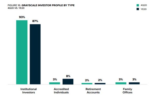 在他们眼中,之所以老币圈人有如此大的反弹,只是因为普通人动了他们的蛋糕。比如以灰度为例,它的投资人都有谁呢?机构投资者、家族办公室、有钱人们,其中机构投资者在2020年占比达到了87%以上,可以说是数字货币圈的Old Money组合。