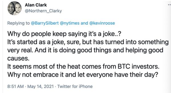 有网友强调,或许狗狗币一开始只是开个玩笑,但后来它就变成了非常真实的东西,而且很多人正在用它去做美好的事情,为有趣的事情、公益事业提供帮助,市场又为什么不能拥抱它。真正的数字货币,应该是属于人民群众的,而不是属于少数人的。