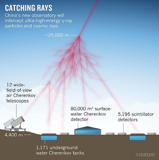 图注:高能粒子产生大气簇射,LHAASO各探测器对簇射的观测(示意图)。来源:《自然》杂志。