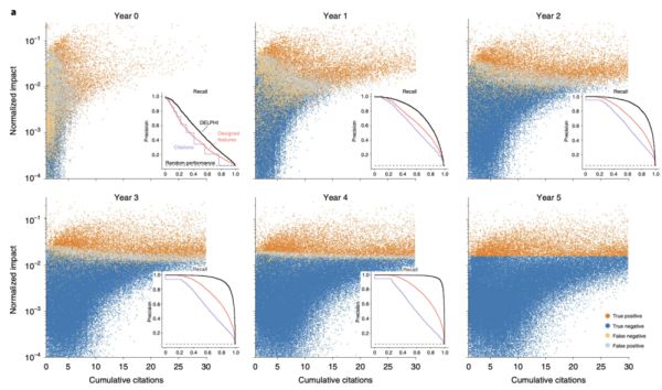 有趣的是,大量正确识别的 “高影响力” 科研文献在初期的引用率并不高,因此,它们就像 “隐藏的宝石”,使用简单的基于引用的指标很难发现它们。
