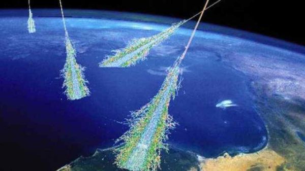 图注:高能宇宙线轰击地球大气,产生的“空气簇射”现象(示意图)。