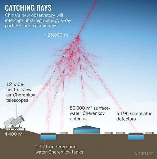 我们知道,LHAASO虽然位于高海拔,但仍然处于大气中,当高能宇宙线来到地球后,首先要与大气层中的原子核发生碰撞,根据爱因斯坦的质能公式,能够产生次级粒子,次级粒子还会产生次级粒子,直到能量低于某个临界值时,次级粒子才停止产生。