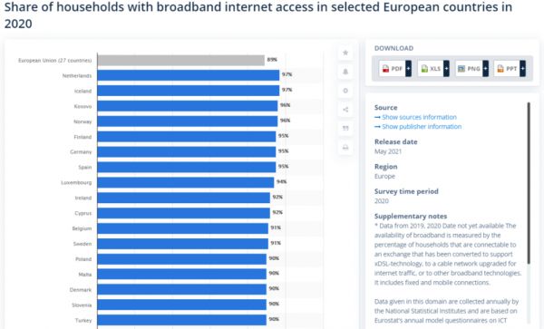 欧盟2020年宽带报告显示,2019年,高速宽带在欧盟国家的覆盖率为44%,使用100Mbps及以上网速的家庭只有26%。