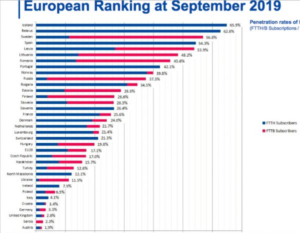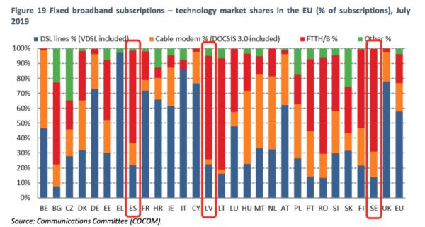 在欧盟内部,网络发展水平呈现不均衡状态。从光纤宽带(包括FTTH光纤到户和FTTB光纤到楼)的覆盖率来看,2019年三季度时瑞典、西班牙、拉脱维亚排在欧盟国家前三位。