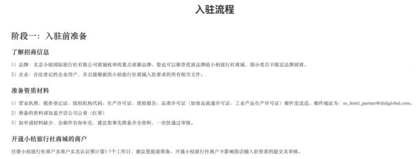 除此外,该官网还设有入驻流程,为相关的旅游提供商进行服务。据官网介绍,招募对象为小桔旅行社商城,商城列举的重点招募品牌、以及其他优质品牌,部分类目不限定品牌招商。