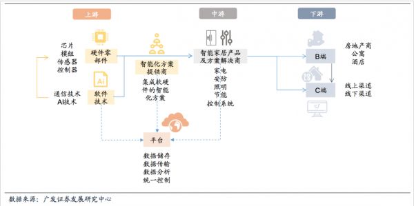拆分产业链,智能家居可分为上游零部件与核心技术提供方、中游单品产品生产商及智能家居系统方案设计商和下游的销售渠道。另外还有不直接提供产品,但意在连接各种产品的平台。