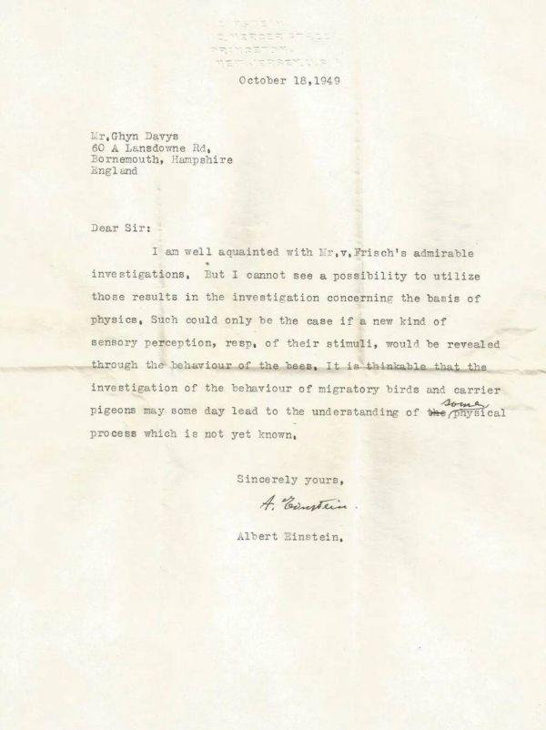 1949年10月,70岁的阿尔伯特·爱因斯坦(Albert Einstein)给英国一位雷达研究者格林·戴维(Glyn Davys)写了一封信。这封信不长,只有约100字不到,似乎是给戴维的回信。最有趣的是,信中的内容不是关于雷达或者它的物理的,反而探讨了一些有关鸟类和蜜蜂,以及它们特别的感官和行为的话题。