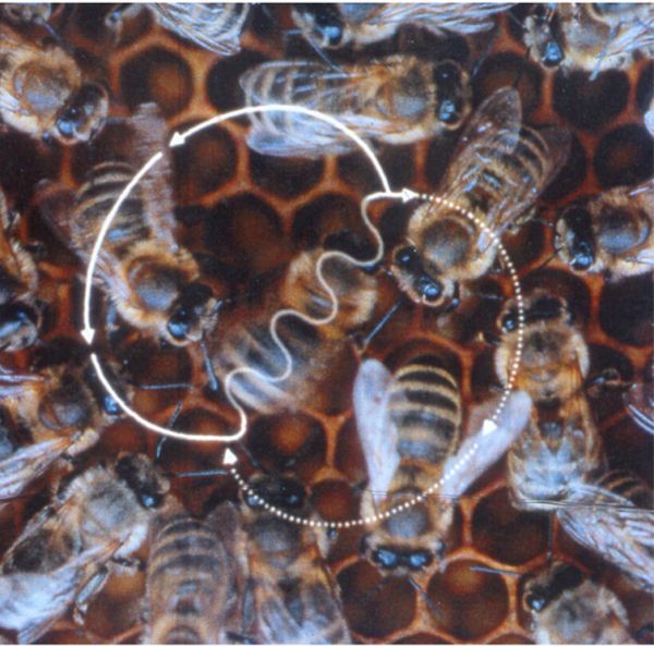 蜜蜂会通过一种8字舞蹈和同伴分享有关花丛、水源和其他重要地标的方向和距离的信息。| 图片来源:J. Tautz and M. Kleinhenz referenced in Lars Chittka (2004), CC BY-SA