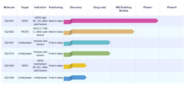 「启德医药」产品管线中进展最快的GQ1001是一种抗体偶联药物,目前在全球多中心临床试验中用于治疗 HER2+实体瘤。GQ1001是根据「启德医药」的连接酶催化偶联技术和拥有专利的开环连接子技术,通过毒素DM1与trastuzumab的定点特异性偶联产生的ADC。利用上述技术,GQ1001的稳定性和均质性显著提高,扩大了GQ1001的治疗窗口。
