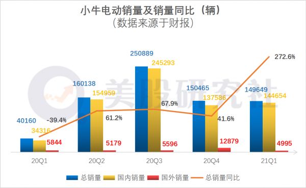 我们先来看看详细的财报数据,一季度小牛实现销量149649辆,同比增长近三倍,国内销量144654辆。在销量增长背后,小牛电动主要通过降价手段拉动了销量。
