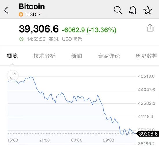 19日,比特币跌破40000美元关口,为2月8日以来首次,跌幅高达13%。