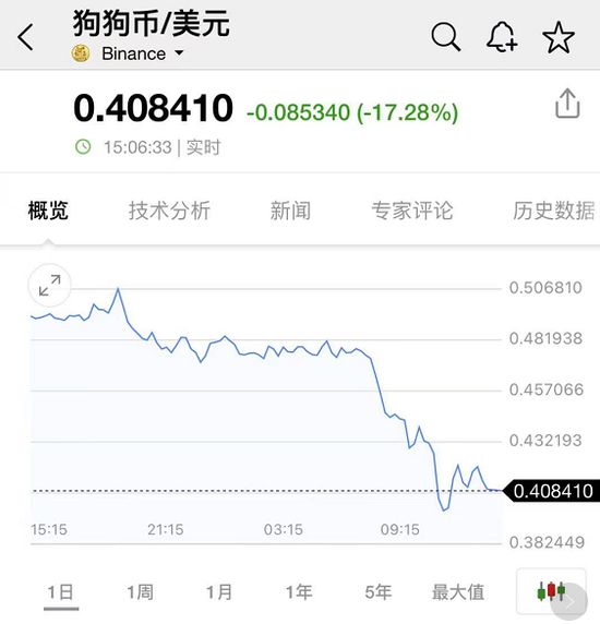 同日,“狗狗币”价格也大幅跳水,失守0.4美元/枚,日内一度跌幅扩大至20%。