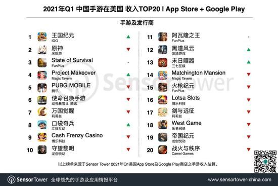 IGG《王国纪元》Q1在美国App Store和Google Play吸金近1.4亿美元,登顶国产手游收入榜。与2020年Q4相比,该游戏在美收入环比激增209%,在刷新自身记录的同时,也打破中国手游在美收入的天花板。此前的纪录由米哈游《原神》在去年Q4创下,达到1.07亿美元。