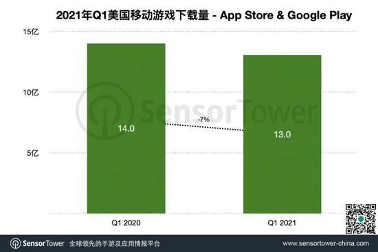 Q1美国App Store和Google Play手游总下载量回升至13亿次,但仍比去年同期疫情刚爆发时减少7%。其中,App Store手游下载量占51%,Google Play占49%。