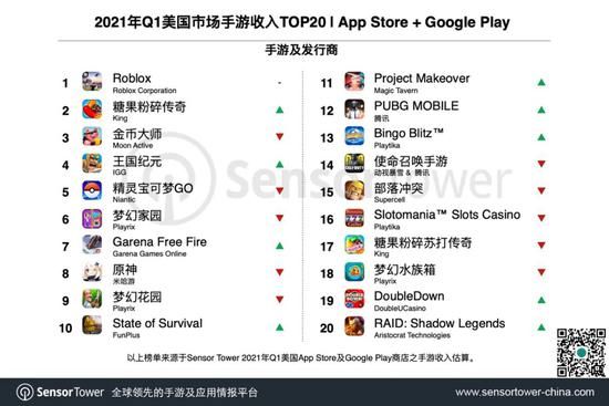 随着疫情缓解,学生陆续返校。但过去一年,Z世代在移动互联网的娱乐习惯已经养成,并直接表现为《Roblox》在榜单的位置。Q1该游戏移动端收入为2.1亿美元,与上个季度持平,依然是美区收入最高的手游,比第2名《糖果粉碎传奇》高出28%。