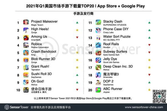 下载榜中,《Project Makeover》以超过1000万次下载蝉联榜首,相较去年Q4增长60%。Joypac于1月下旬推出超休闲游戏《ABC Runner》,Q1该游戏在美区获得近360万次下载,成为榜单中唯一的新面孔。