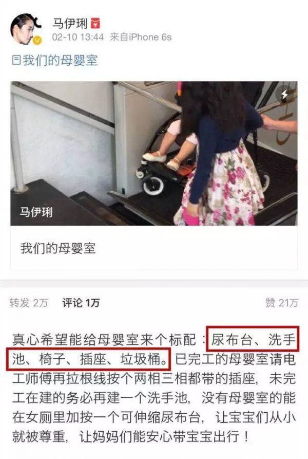 2016年,明星马伊琍在微博上发布了长文《我们的母婴室》,长文讲述了马伊琍夫妇带两个孩子出游在机机场母婴室的遭遇。因为小女儿突然拉肚子,抱着她去母婴室,却发现很多必要的设备都没有。没有可以用的插座,没有洗手池,也没有洗手液,而且自动感应水龙头的敏感度也极差,在赶飞机的同时又要处理这些事,让人干着急。在文章中,马伊琍提出了中国城市母婴室设置的常见问题: