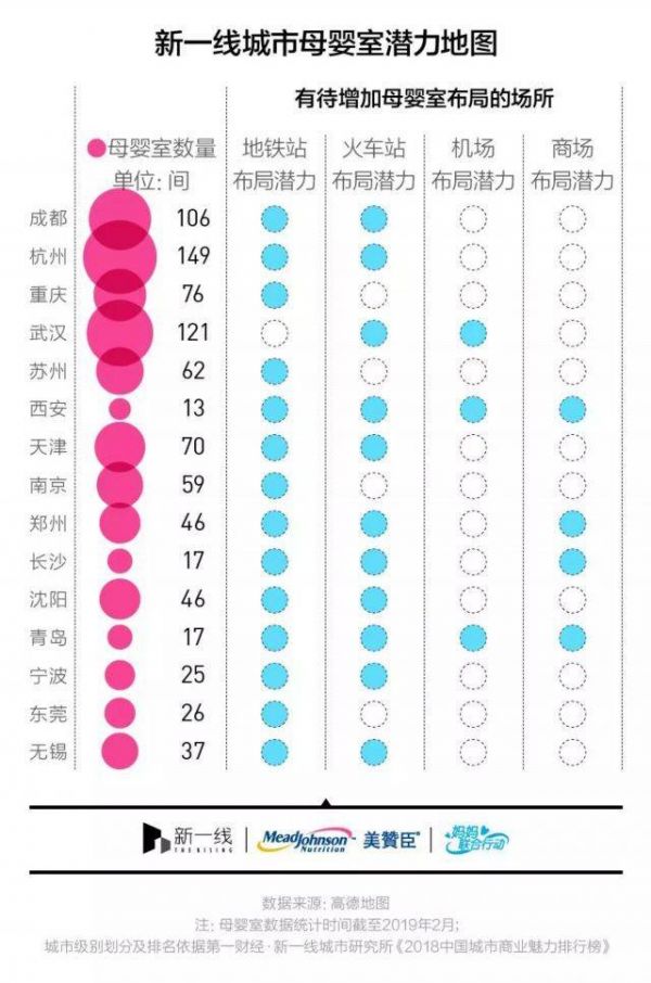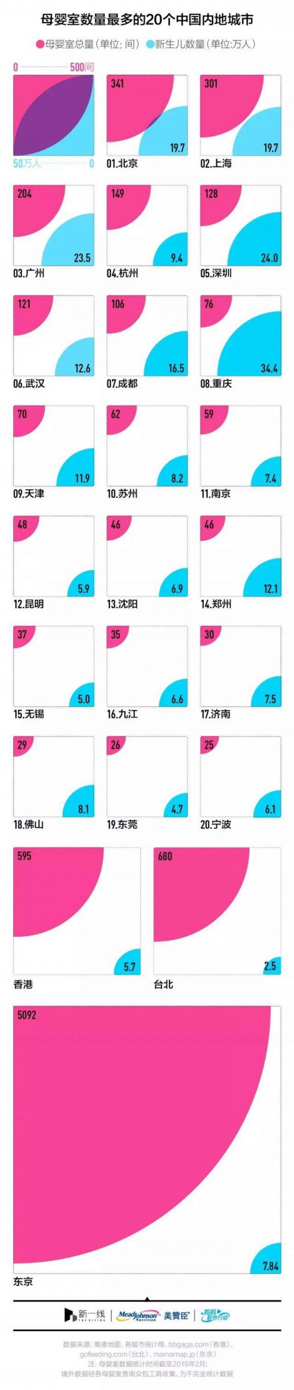 与此相对比的,据不完全统计,中国香港目前共有595间母婴室,平均298个家庭共享1间母婴室;台北的母婴室数量达到了680间,每间母婴室只需要118个家庭共享。东京23区的母婴室数量达到了5092间,供应量已基本达到理想水平,平均1间母婴室只需要供47个家庭共享。