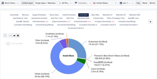 根据App Annie在2020年年初的统计,该应用每月有10亿视频播放量,通过安装吸引了美国短视频市场27%的份额,仅次于TikTok的59%。