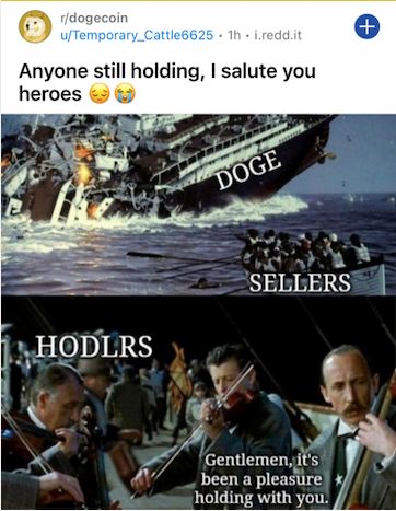 海外网站Reddit论坛上,狗币持有者自嘲“坚持持有者”就好像“在泰坦尼克沉船时淡定演奏的音乐家”。
