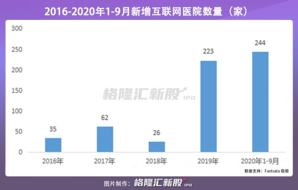 从新成立互联网医院数量来看,仅2020年前9个月,就有244家互联网医院挂牌。而2019年全年,互联网医院共新增223家,2016年-2017年新增数量不超过100家。目前,中国已上线互联网医院已超过1100家,7700家二级以上医院提供线上服务。