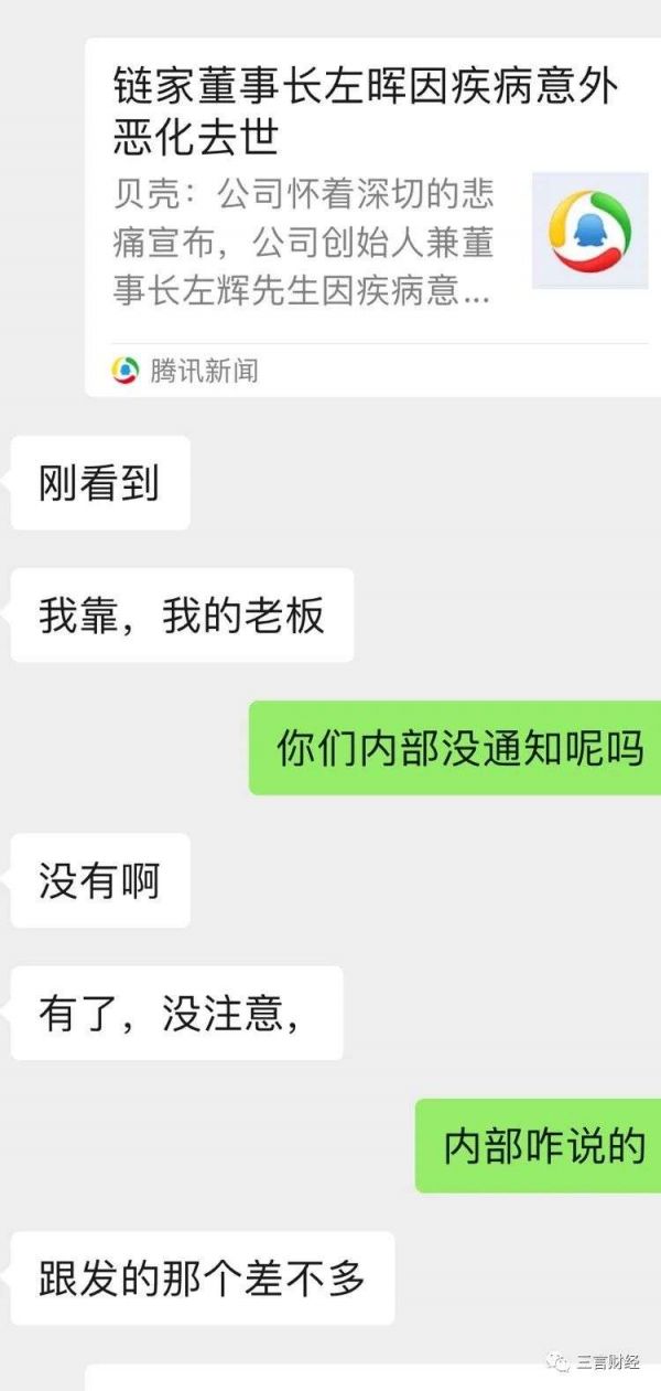 关于左晖去世的消息,链家内部员工告诉三言财经,公司内部已经通告此事,大家对此也深感震惊。该员工表示,此前知道其身体存在健康问题,但没想到突然人就走了,深感惋惜。