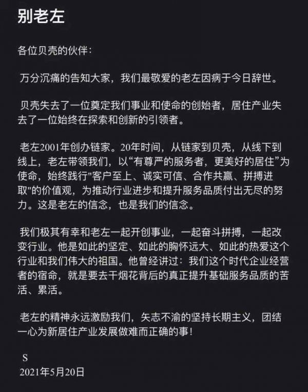 5月20日消息,贝壳官方宣布,公司创始人兼董事会主席左晖先生因病情意外恶化于2021年5月20日逝世。