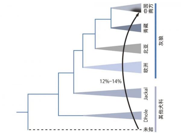 科学探究的过程总是充满着未知,但也经常会有意想不到的发现。虽然没有找到家犬的直接祖先,但我们发现中国南方的狼形成了一个单独类群,它是从西藏狼和中国北方狼中独立出来的。真正令人感到惊奇的是,虽然各种分析方法均表明浙江灰狼与南方灰狼聚为一枝,但浙江灰狼具有其它犬科动物12%—14%的基因组分,这种成分可能来源于中国南方和东南亚地区的豺,这暗示种间的基因交流可能对犬属动物的物种形成模式和种群结构塑造起到了关键作用[6]。