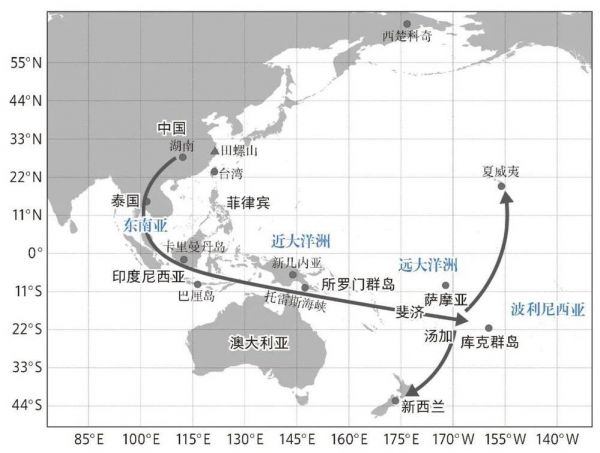 欧洲殖民者到达前的太平洋岛屿家犬可能的扩散路线[7]