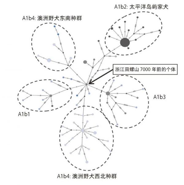 世界上75%现生家犬有的线粒体基因组属于类群A。亚洲是这种类群最丰富的地区,包含全部的6种亚类群。来自于长江黄河流域的古代家犬绝大多数(96%)属于类群A,这种比例与现生的泰国家犬(100%)、澳洲野犬(100%)及欧洲殖民者到来之前的古代太平洋岛屿家犬(100%,后面简称太平洋岛屿家犬)相似,这提示我们,中国古代家犬可能与这些地区的犬类在历史上有某种联系。通过对这一类群个体进行更细致的研究,发现中国古代材料中的大多数属于亚类群A1b(69.2%),同时也发现澳洲野犬(100%属于A1b4)和太平洋岛屿家犬(95%属于A1b2)具有极高的A1b类群比例,这使我们相信它们之间确实存在着历史联系。基于线粒体基因组序列构建的邻接法网络关系图的研究发现,浙江田螺山的个体(距今约7000年)处于选取的117个亚洲和大洋洲亚类群为A1b个体的中间位置,可能代表它来自于A1b类群的祖先群体。基于这些明显的证据,我们开始专门研究太平洋岛屿家犬与澳洲野犬是否真的来自于长江黄河流域的古代家犬,以及它们是如何扩散的。