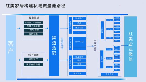 其实从大家居集团视角看做私域本质是“从线下经销商,门店,企业微信社群,导购,朋友圈,直播,小程序店铺,天猫,京东”到公域数据平台的打通。