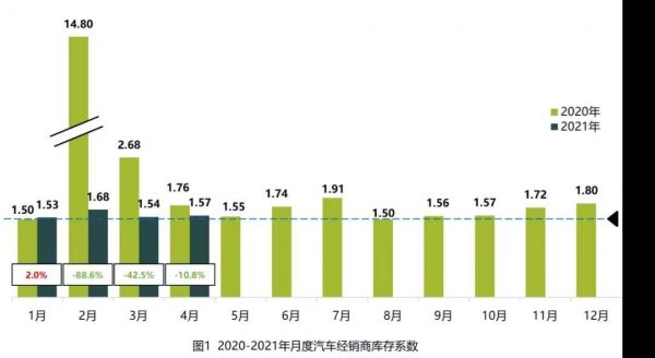 中国汽车流通协会(简称流通协会)数据显示,今年1~4月,经销商库存系数分别为1.53、1.68、1.54和1.57,低于去年四季度库存水平。
