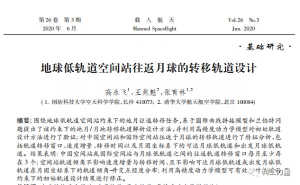 去年6月,一篇国家自然科学基金载人航天预先研究项目论文在《载人航天》杂志发表,主题为《地球低轨道空间站往返月球的转移轨道设计》,通过详尽的轨道动力学测算,作者得出结论:“分析表明中国空间站或国际空间站与月球低轨道之间的往返转移存在轨道转移窗口,且每月至少存在3个……基于地球低轨道空间站的载人月球探测飞行模式相较于近地轨道一次对接或阿波罗直接登月模式,虽在轨道转移窗口方面受到限制,但其支持载人飞船的可重复使用,可充分发挥空间站的在轨服务能力,为未来地月空间的商业化开发提供了可行方案。”