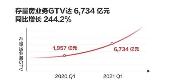 据财报数据,贝壳各业务板块均维持高速增长。其中,存量房交易GTV为6734亿元,同比增长244.2%。