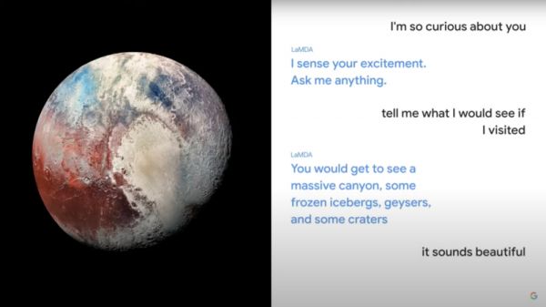 在本次谷歌I/O大会上,LaMDA充分展示了强悍的对话能力。[3]演示环节中,LaMDA扮演了冥王星的角色,与用户进行对话。
