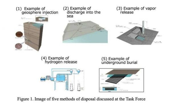 海洋排放并非唯一的核废水处置方案。从理论上说,除海洋排放(discharge into the sea)外,处置核废水还有蒸汽释放(vapor release)、氢气释放(hydrogen release)、地下掩埋(underground burial)以及向岩石圈注射(geosphere injection)4种方式。