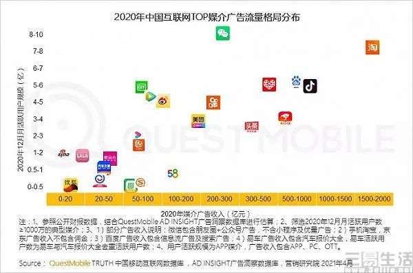 当用户沉迷于在抖音刷视频而不是在微信/QQ上聊天时,当抖音、快手等短视频平台超越即时通讯,成为网民最常使用的品类背后,也代表着国内互联网已经发生了新一轮的流量来源转移。根据QuestMobile公布的《2020年中国互联网广告市场洞察》显示,抖音的媒介广告收入仅次于淘宝,达到了千亿级别,再加上处于300-500亿元区间的今日头条,字节跳动差不多占据了整个国内互联网广告市场的四分之一。并且值得一提的是,字节跳动已经在大力推进通用搜索引擎业务,拥有了“信息流广告+搜索广告”的双引擎,而这则其他互联网广告平台所不具备的优势。