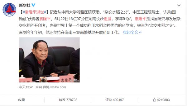 5月22日13:38,湖南日报、新湖南客户端发布了袁隆平逝世的消息。报道称,“共和国勋章”获得者、中国工程院院士、国家杂交水稻工程技术研究中心主任、湖南省政协原副主席袁隆平,因多器官功能衰竭,于2021年5月22日13时07分在长沙逝世,享年91岁。