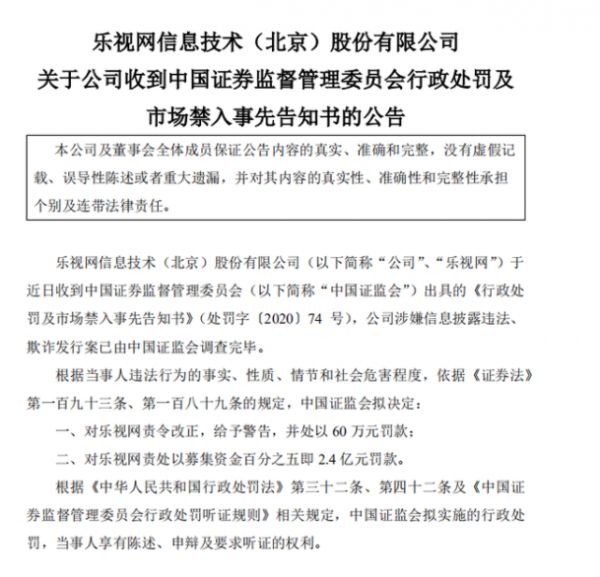 乐视网被公开谴责处分 贾跃亭禁止担任上市公司要职