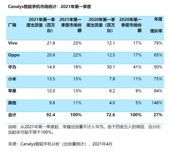 首先就乐视手机而言,在发布会上,吴国平介绍,乐视将于今年第三季度推出乐视手机,根据Canalys发布的2021年第一季度中国智能手机出货数据,华为、小米、OPPO、vivo四家手机厂商合计占据了76%的市场份额,总出货量达到7千万部手机,如果加上苹果的话,这一市场份额将进一步高达89%。