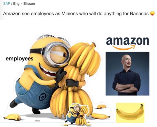 如今,别家科技公司的休息区都是各种水果饮料和零食,而当镜头转到亚马逊,就变成一杯苦咖啡+一堆香蕉,亚马逊“香蕉厂”的牌子也就这么慢慢立了起来。员工们甚至开玩笑说,亚马逊可能觉得员工们都是小黄人(Minions),愿意为了香蕉而付出一切。