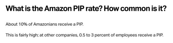 有平台曾做过一个简单统计,亚麻逊的员工PIP比率约为10%,其他科技公司仅仅在0.5%到3%之间,而不同于亚马逊PIP就约等于裁员,像谷歌、苹果等,即便你被PIP了也只是有极小的概率会被开除。