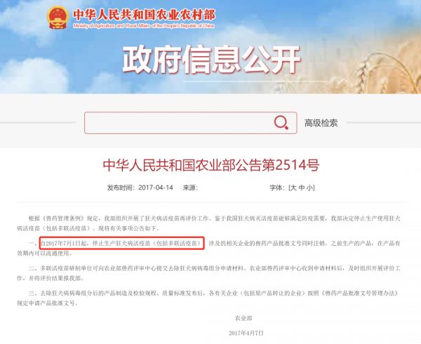 这种情况一直持续到2017年。当年4月,农业部公告,我国狂犬病灭活疫苗能够满足防疫需要。自2017年7月1日起,停止生产狂犬病活疫苗(即减毒活疫苗)[14]。