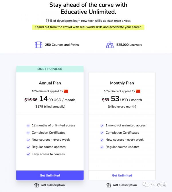 在商业变现上,Educative面向C端用户,提供按年付179美元(14.99美元每月)的订阅产品,付费用户可以在平台学习所有课程,学习后的证书认证。按月购买则需要支付53美元每月,可以看到年付订阅是Educative主推的C端产品。
