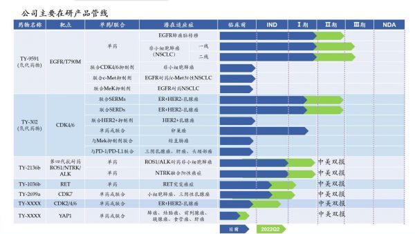目前,「同源康医药」已完成了两个一类新药IND申报并已开展I期临床试验。其中,公司核心产品TY9591对标奥希替尼,临床前试验和初步临床结果表明该产品具有更好的临床疗效和安全性,有望成为同类产品的Best-in-class创新药。TY9591也在同步开拓脑转移适应症,有望成为First-in-class治疗EGFR突变肺癌脑转移的创新药。此外,公司自主开发的两个新靶点药物将在近期与合作伙伴分别在中国/美国提交IND申请,有望在年内进入临床阶段。